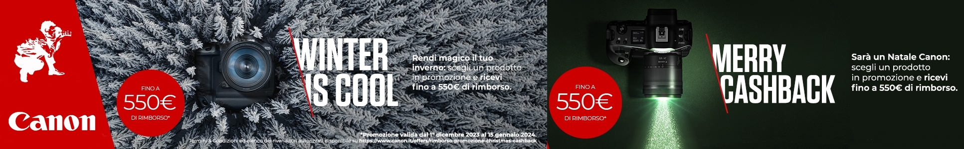 Dal 1 dicembre 2025 fino al 1 febbraio 2026 CANON ti sconta con un cashback fino a 500 euro su fotocamere, obiettivi e stampanti selezionati e acquistando insieme 2 prodotti in promozione si otterranno ulteriori euro 100 di cashback.