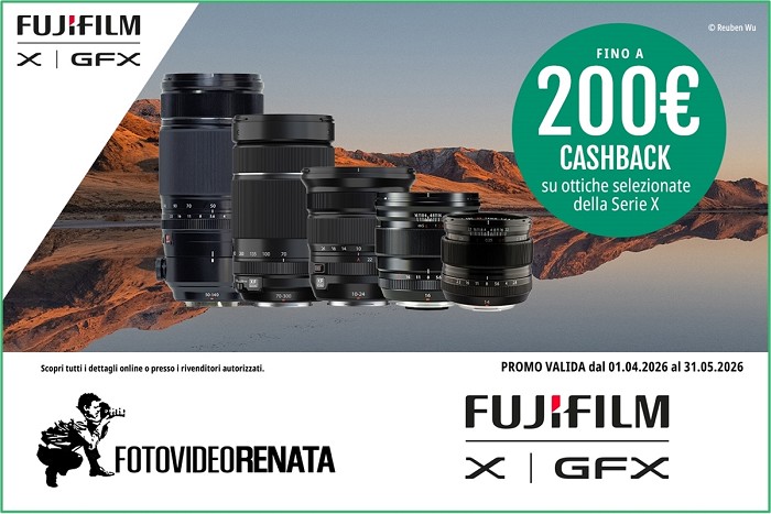 01/04/2026 - Dal 1 aprile fino al 31 maggio 2026 FUJIFILM ti sconta con un cashback fino a 200 euro su una selezione di obiettivi serie X. La promozione è valida solo nei negozi autorizzati e con garanzia ufficiale FUJIFILM ITALIA.