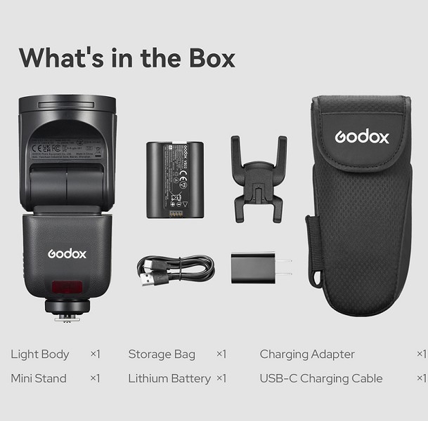 Alimentato da una batteria ricaricabile al litio da 7,2 V e 2200 mAh inclusa e con un tempo di ricarica di 1,7 secondi, il V1 mid consente 650 flash a piena potenza e una durata del flash compresa tra 1/600 e 1/20.000 di secondo. Un altro punto di forza è la lampada pilota LED da 2 W integrata con temperatura di colore 5300 K (+/-200 K) e luminosità regolabile (1-10). Gli indicatori di batteria sul pannello del display informano sul livello di carica rimanente. Godox include nella confezione il cavo di ricarica USB-C e l'adattatore.